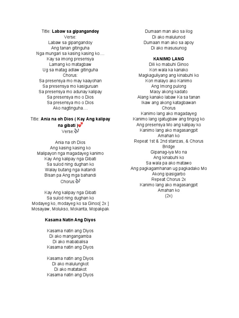 Di ako mangangamba C D Di ako mababalisa G Kasama natin ang Diyos G Kasama natin ang Diyos A Di ako malulungkot C D Di ako matatakot G Kasama natin ang Diyos Bb Dumaan man ako sa ilog G Di ako malulunod A Dumaan man ako sa apoy D Di ako masusunog. All lyrics and chords are property and copyright of their owners. Posted by orlyglenn at 1135 PM.
